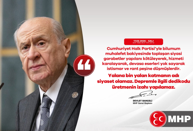 Depremle ilgili dedikodu üretmenin izahının, "Yalana bin yalan katmanın adının siyaset" olamayacağını belirten Bahçeli, "Doğruyla yanlışı tefrik edemeyen bir siyasetçinin vicdanından bahsedilemez. İyiyle kötüyü fark edemeyen bir siyasetçinin erdemli olmasını beklemek ise boşa kürek çekmekle eşdeğerdir. CHP yönetimi, doğal afetten siyasi afet çıkarmak için elinden geleni ardına koymamıştır." dedi.