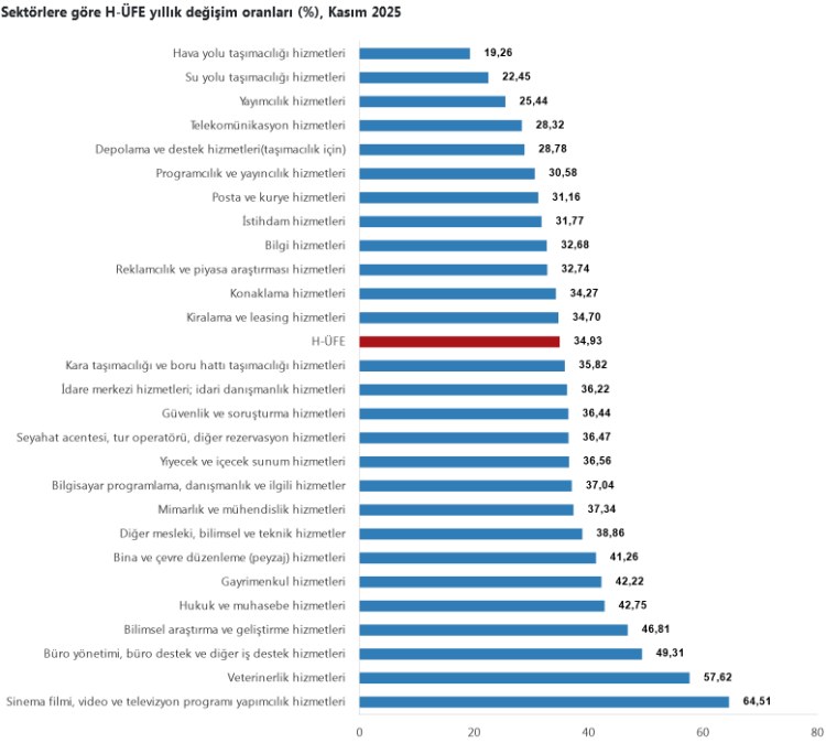 Yıllık bazda en dikkat çekici artış gayrimenkul hizmetlerinde yaşandı. Kasım ayında bir önceki yılın aynı ayına göre; ulaştırma ve depolama hizmetlerinde yüzde 31,51, konaklama ve yiyecek hizmetlerinde yüzde 36,00, bilgi ve iletişim hizmetlerinde yüzde 35,19, gayrimenkul hizmetlerinde yüzde 42,22, mesleki, bilimsel ve teknik hizmetlerde yüzde 39,35, idari ve destek hizmetlerde ise yüzde 38,49 artış gerçekleşti.
