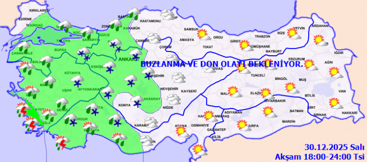 Kuzey, iç ve doğu kesimlerde buzlanma ve don olayı beklendiğinden yaşanabilecek olumsuzluklara karşı dikkatli ve tedbirli olunması gerekmektedir.
