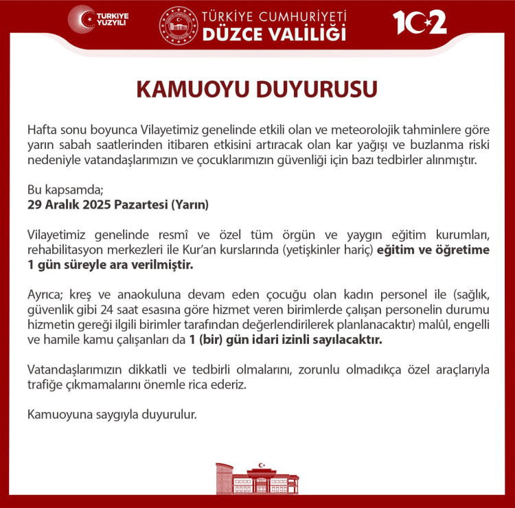 Etkili olan yoğun kar yağışı dolayısıyla birçok kentte yoğun kar yağışı etkisini arttırdı. 29 Aralık Pazartesi günü için tatil haberleri ilk olarak Van, Düzce, Zonguldak, Karabük, Kastamonu ve Şırnak illerinden geldi.