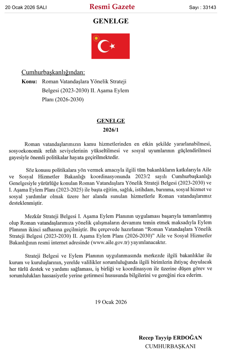 Bugünkü Resmi Gazete'de yayımlanan Cumhurbaşkanlığı Genelgesi ile Roman Vatandaşlara Yönelik Strateji Belgesi (2023-2030) II. Aşama Eylem Planı (2026-2030) yürürlüğe girdi.