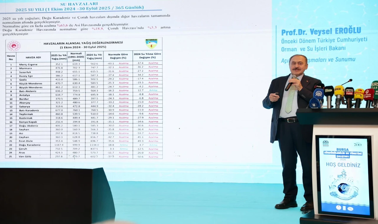 Bursa’da son bir yılda barajlardaki su miktarının yüzde 30 civarında azaldığını vurgulayan Başkan Mustafa Bozbey, bilim insanlarının raporuna göre, 2026 yazının 2025’ten daha sıcak geçeceğini ve bir buçuk derece sıcaklık artışının yaşanacağını söyledi. Bursa’nın artık su şehri olmadığını da vurgulayan Başkan Mustafa Bozbey, “Suyu asla siyaset malzemesi yapmamalıyız. Tam tersine suyu nasıl koruyacağımızı, gelecek yıllarda nasıl su sorunu yaşamayacağımızı hep birlikte konuşmalıyız. Projeler ortaya koymalıyız. DSİ tarafından Çınarcık Barajı yapılmamış olsaydı, bugün Bursa için daha kötü günleri bekleyebilirdik. Bugün en büyük havzaya sahip olan Çınarcık Barajı'dır. Bu havzalarımızda maden aramayla ilgili herhangi bir işlemin yapılmaması tarafındayız. Çünkü her açılan ocağın suyumuzu kirlettiğinin farkındayız. Hatta suyun ve Bursa’nın geleceği için bu havzada maden faaliyeti yapan kurumların izinlerinin iptal edilmesinin doğru olacağına inanıyoruz” diye konuştu.